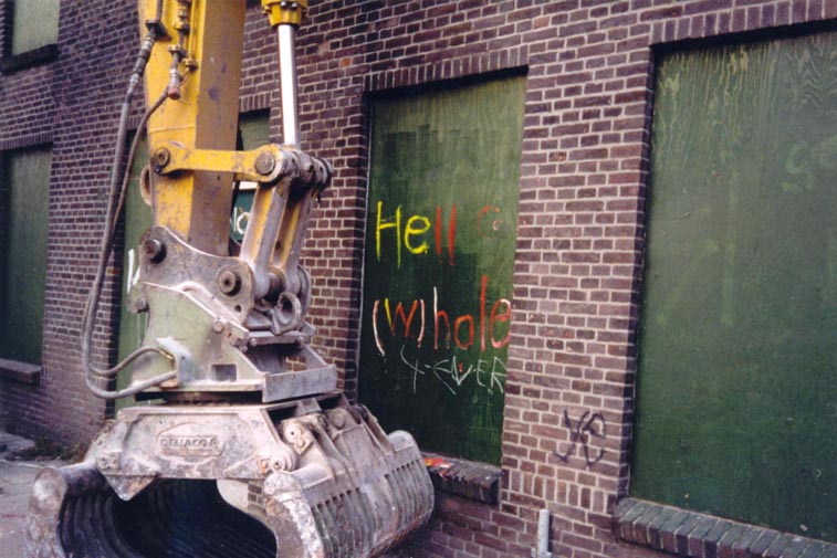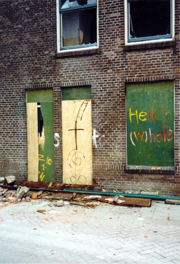 Hell (w)hole was an installation art work made by Syd Tovenaar (with the help of Tjepkema) that existed for a short time in a Dutch slum in the port city of Rotterdam in The Netherlands. The work involved police, government officials, vandals, artists, literature, fire, visual art and was both conceptual and political in nature and design. The street slowly self destructed as it became part of a demolition project and this process is revealed in the photo document of which a part is reproduced above. Other than this document, the work only exists in a work of literature - Dreaming Myself to Death by Syd Tovenaar. |
